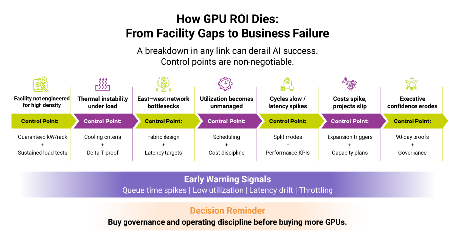 Despite the promise, many GPU deployments fail to deliver expected ROI because the underlying data center is not designed for sustained GPU workloads.
